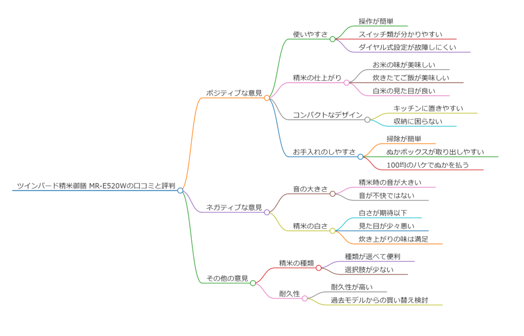 ツインバードの精米器「MR-E520W」は、家庭用のコンパクトな精米機として人気があります。以下に、ポジティブ、ネガティブ、その他の意見を分類してまとめました。