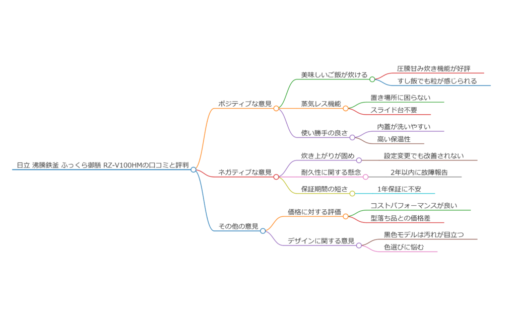 日立の炊飯器「沸騰鉄釜 ふっくら御膳 RZ-V100HM」についての口コミや評判を、ポジティブ、ネガティブ、その他の意見に分類し、マインドマップで可視化しました。